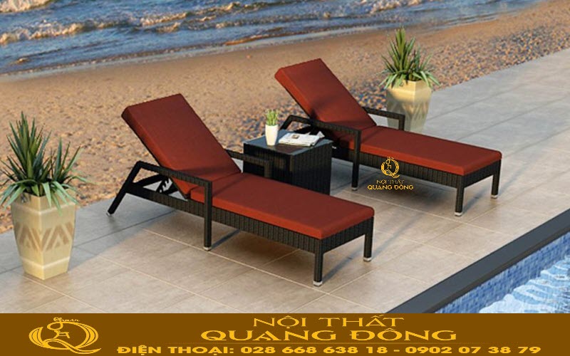 Bộ sản phẩm QD-568 còn đi kèm chiếc bàn nước vuông nhỏ gọn, được đặt ở giữa hai ghế nằm. Bàn có cùng chất liệu và kiểu dáng, tạo nên sự đồng bộ và hài hòa trong tổng thể bố cục. Bề mặt bàn vừa đủ để đặt ly nước, sách báo, điện thoại hoặc các vật dụng cá nhân khác khi nghỉ ngơi ngoài trời.