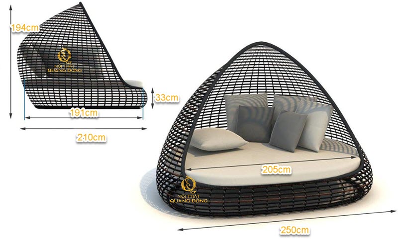 Giường tắm nắng QD-533 là sự kết hợp hoàn hảo giữa thẩm mỹ tinh tế và công năng nghỉ dưỡng cao cấp. Với thiết kế hình vòm nửa tròn thu nhỏ dần như một chiếc chóp nón, sản phẩm không chỉ là điểm nhấn ấn tượng trong không gian sân vườn, hồ bơi hay khu resort, mà còn mang lại cảm giác riêng tư, thư thái tối đa cho người sử dụng. Được đan hoàn toàn bằng sợi mây nhựa bán nguyệt cao cấp kích thước 14 ly, màu nâu giả gỗ sang trọng bền màu phù hợp với nhiều không gian thiết kế, bền bỉ với thời tiết, vừa thể hiện đẳng cấp sang trọng trong từng đường nét thiết kế.