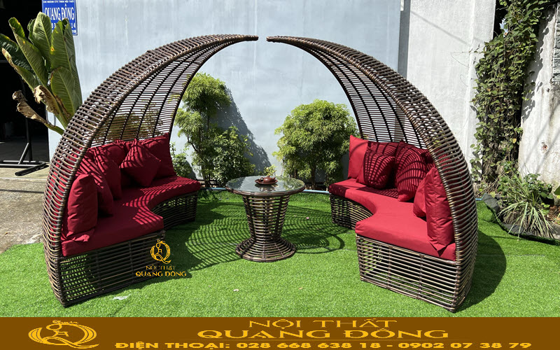 Khác với những mẫu sofa ngoài trời thông thường, mẫu sofa đan nhựa giả mây QD-655 gây ấn tượng mạnh mẽ bởi phần mái vòm cong mềm mại. Thiết kế này không chỉ mang tính thẩm mỹ cao mà còn giúp giảm bớt phần nào ánh nắng, tạo bóng mát và không gian riêng tư. Mái vòm có thể trở thành điểm nhấn trung tâm của toàn bộ khu vườn, đồng thời mang lại cảm giác thư thái cho người ngồi bên trong.