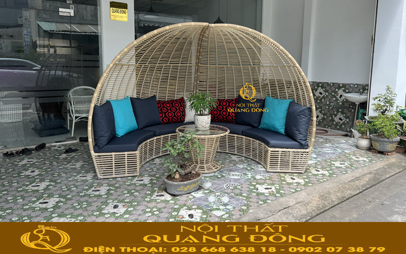 Bộ sofa giả mây QD-655 là lựa chọn hoàn hảo cho những ai yêu thích phong cách ngoại thất ấn tượng, hiện đại nhưng vẫn mang lại sự thư giãn tối đa. Điểm nhấn đặc biệt của mẫu sofa này chính là thiết kế mái vòm độc đáo, tạo cảm giác vừa sang trọng, vừa gần gũi với thiên nhiên. Sản phẩm gồm 2 mảnh ghép tạo thành một bộ sofa bán nguyệt nửa hình tròn, phù hợp để đặt ở khu vực sân vườn, ban công rộng, hồ bơi hay khu nghỉ dưỡng cao cấp.