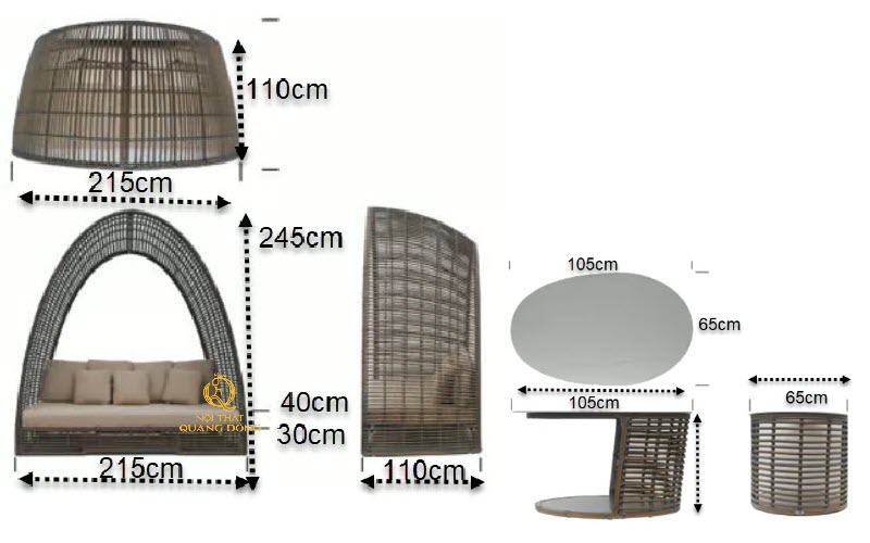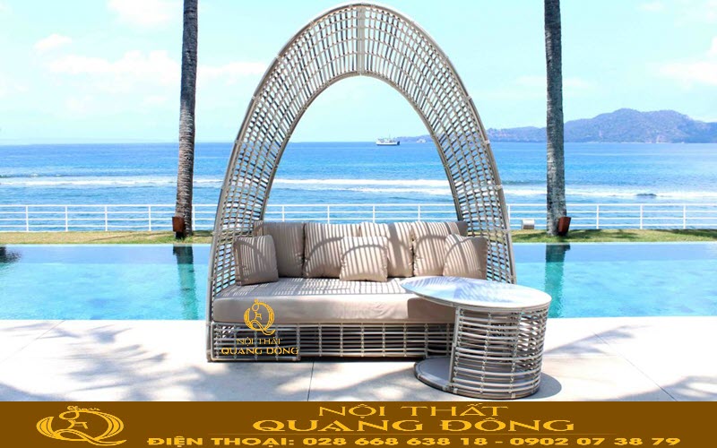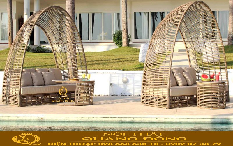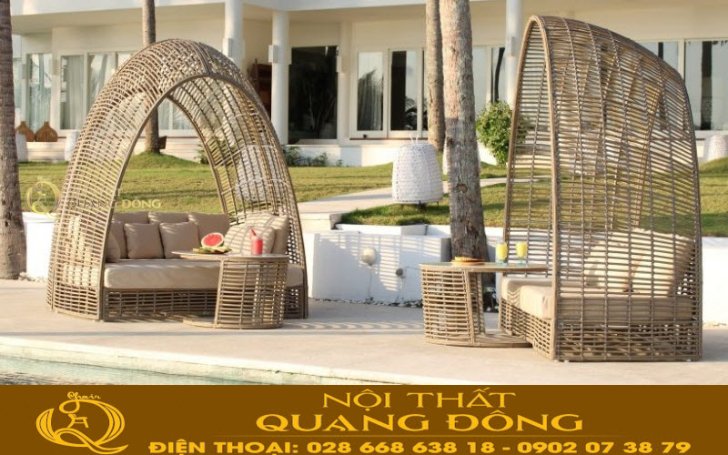 Sofa giả mây QD-708 được thiết kế mái vòm độc đáo, tạo điểm nhấn nổi bật cho ngoại thất sân vườn, khu vực hồ bơi, bãi biển, sản phẩm được đan lát thủ công mỹ nghệ truyền thống mang nét đẹp mộc mạc tự nhiên, gần gũi với cây cỏ hoa lá.