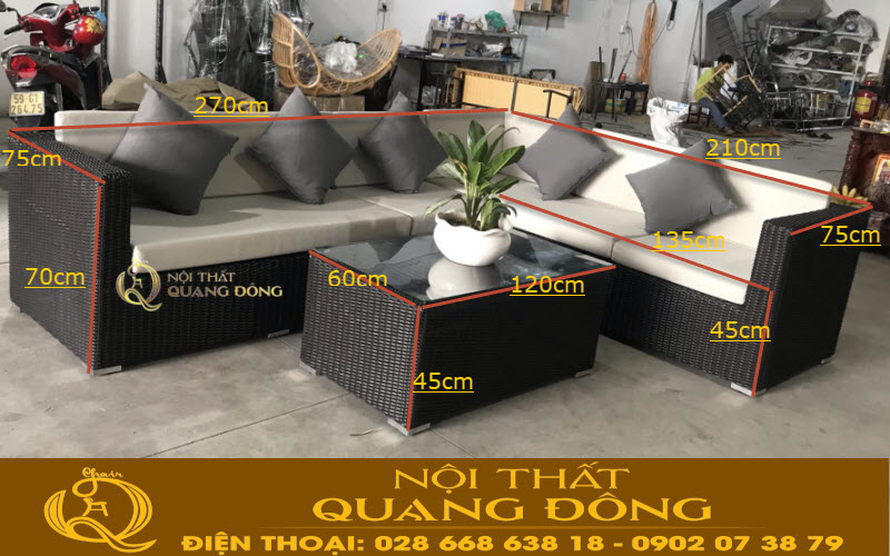 Bộ sofa giả mây QD-709 được thiết kế dạng góc chữ L, gồm hai phần ghép lại với chiều dài lần lượt là 270cm và 210cm, tạo nên hình dáng vuông vức, gọn gàng nhưng vẫn đủ rộng để sử dụng từ 5 đến 6 người ngồi cùng lúc. Kiểu dáng chữ L không chỉ giúp tối ưu không gian kê đặt trong các khu vực góc, mà còn tạo sự gắn kết cho các buổi tụ họp, tiếp khách, nghỉ ngơi ngoài trời.