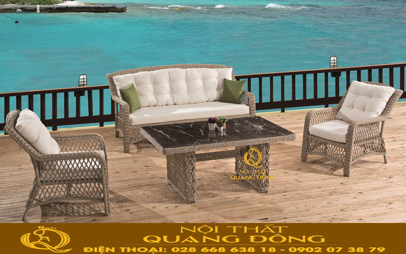 Sofa mây nhựa QD-720 được đan bằng sợi mây nhựa tròn, sợi mây nhựa được làm từ nhựa Polyester có chứa hoạt chất chống tia UV, kháng nước tốt. Góp phần bảo vệ sản phẩm không bị phai màu hay giòn mọt ở những điều kiện thời tiết khác nhau.