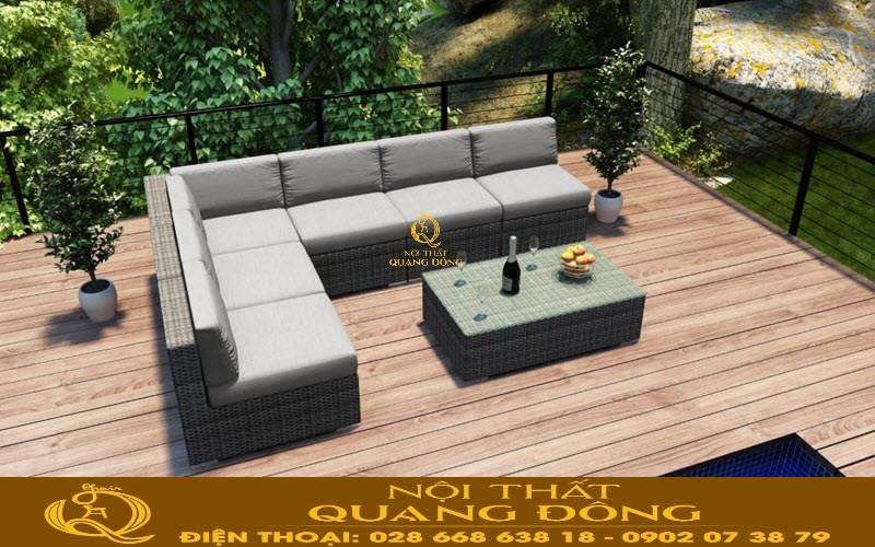 Sofa giả mây QD-728 sử dụng sợi mây nhựa dẹp bản 7-8 ly hàng cao cấp, chất liệu sử dụng thông dụng ngoài trời, sân vườn, được các chủ đầu tư quan tâm, tìm kiếm cho các dự án ngoài trời của các chung cư, căn hộ, khu nghĩ dưỡng,..Sợi mây nhựa được làm từ nhựa PE tổng hợp có hoạt chất chống tia UV, kháng nước tốt nên được sử dụng thoải mái ở không gian ngoài trời mà không cần lo ngại về độ bền của nó. Sợi mây nhựa dẹp có mức giá rẻ nhất so với sợi mây nhựa bản nguyệt và tròn, nhưng khi bạn lựa chọn kiểu đan khác nhau, thì giá thành sẽ thay đổi, vì mỗi kiểu đan ảnh hưởng đến số lượng của sợi mây nhựa, độ nặng sản phẩm khác nhau.